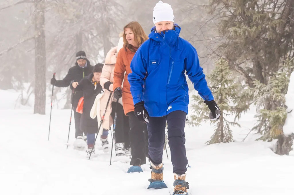 Join us on a snowshoeing trek through the enchanting winter forests. As we hike across the snowy landscape, we take time to observe nature and discuss the cycle of life in Finland's unique environment.